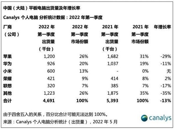 近日,Canalys发布了中国大陆地区平板电脑出货量及年增长率,其中,苹果和华为仍占据头两名,但年增长率都遭遇不同程度的下跌。